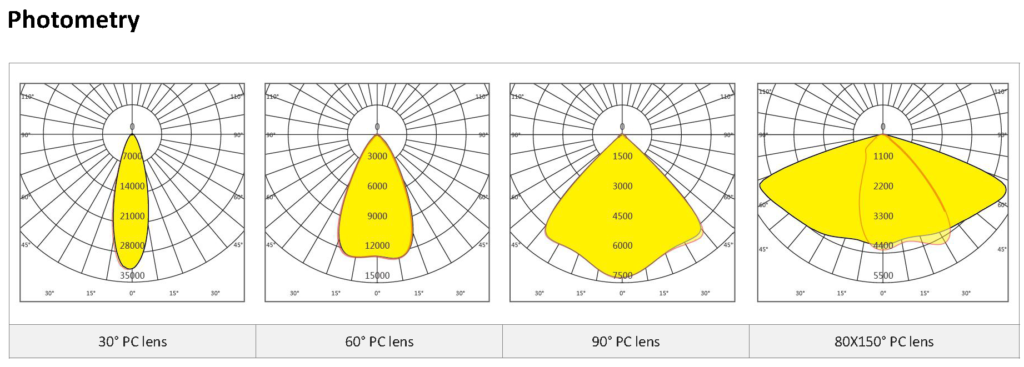 • Optical lens from 30°, 60°, 90°, 120°, 30X70°, 60X90°, 70X145°, 80X150°
